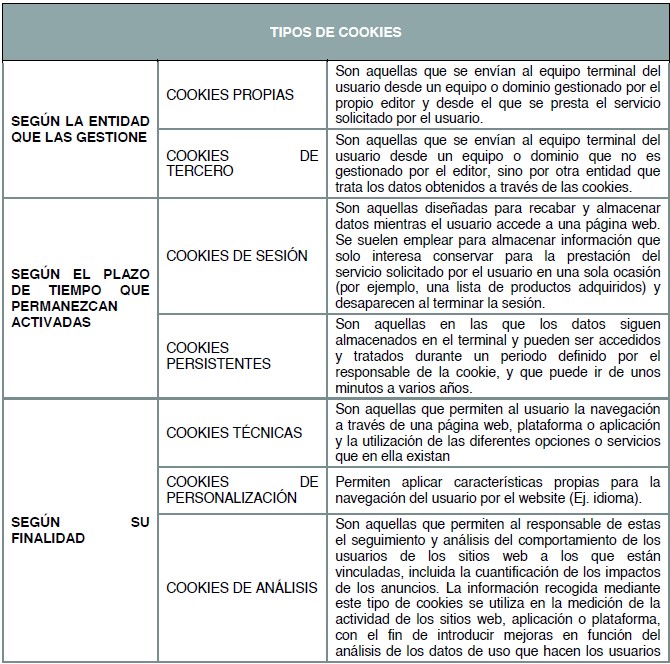La información que le proporcionamos a continuación le ayudará a comprender los diferentes tipos de cookies: